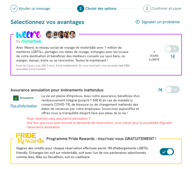 Pride Rewards est notre programme de fidélité qui vous permet de gagner des points Pride dès votre premier dollar/euro dépensé pour toute réservation sur misterb&b. Vous pouvez échanger ces points contre des bons de voyage, les offres sélectionnées de nos partenaires ou même obtenir de l’argent.