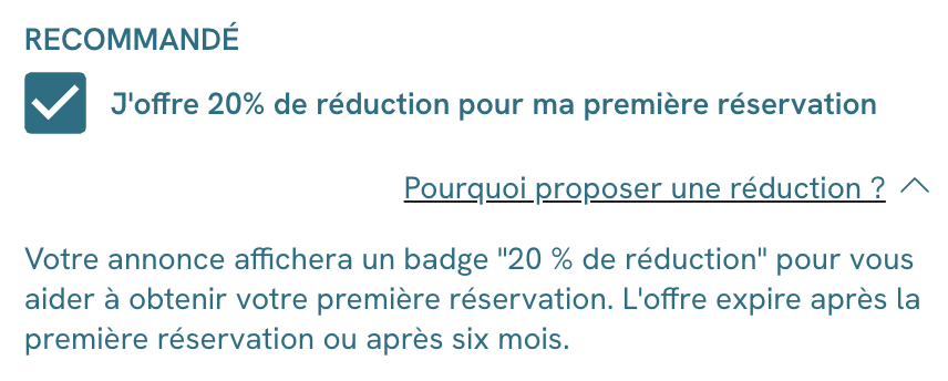 Lorsque vous créez une annonce sur misterb&b pour la première fois, vous avez la possibilité de proposer une remise de 20 % sur votre première réservation pendant les six premiers mois.